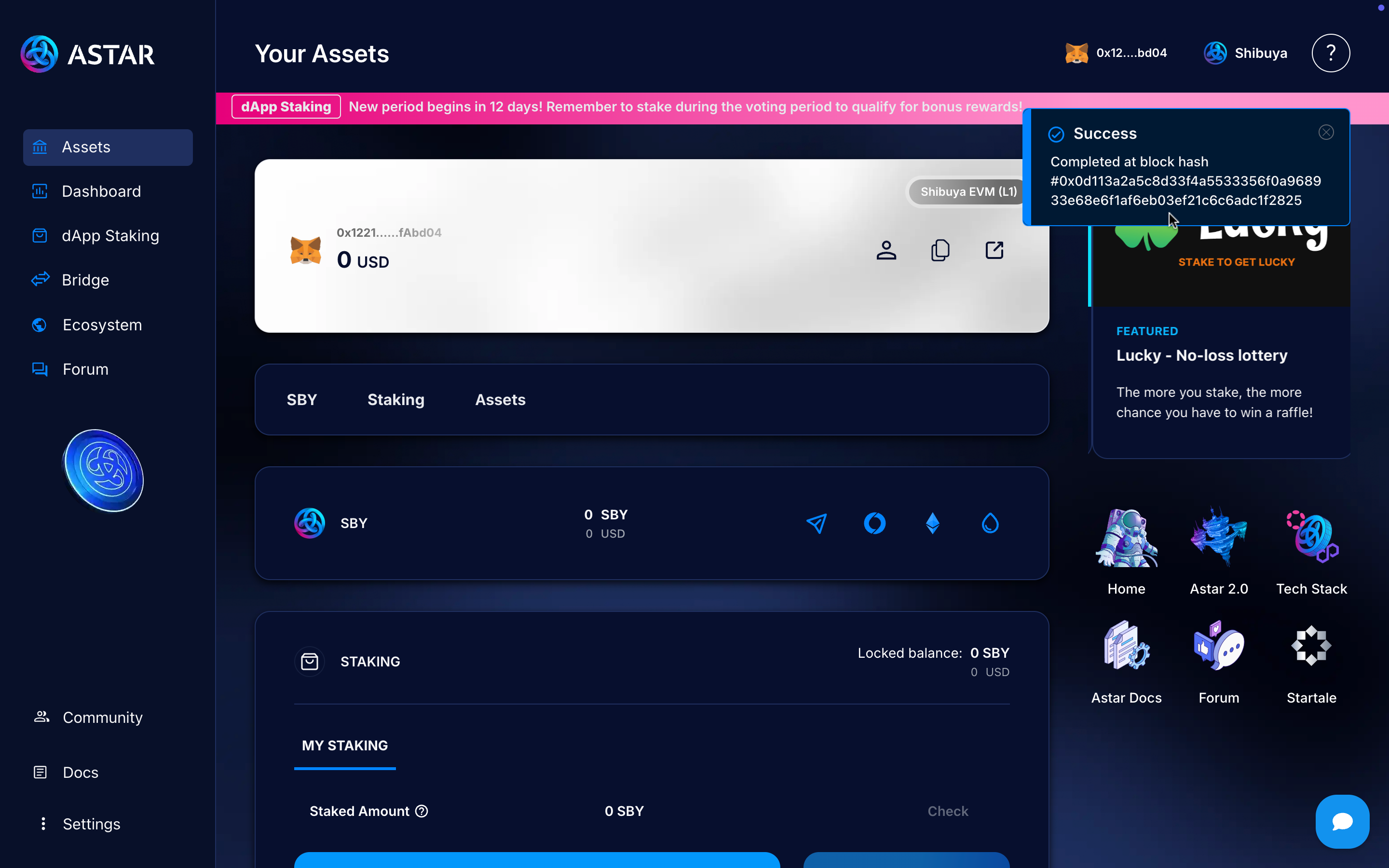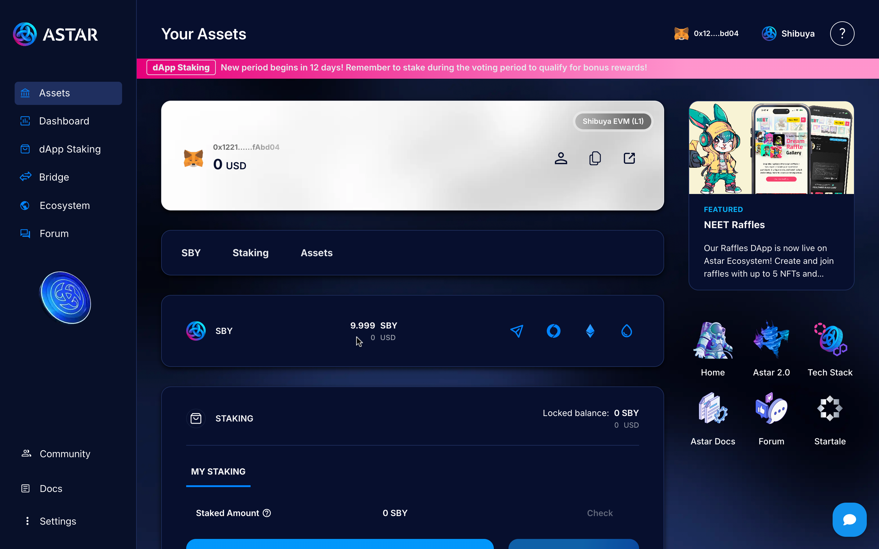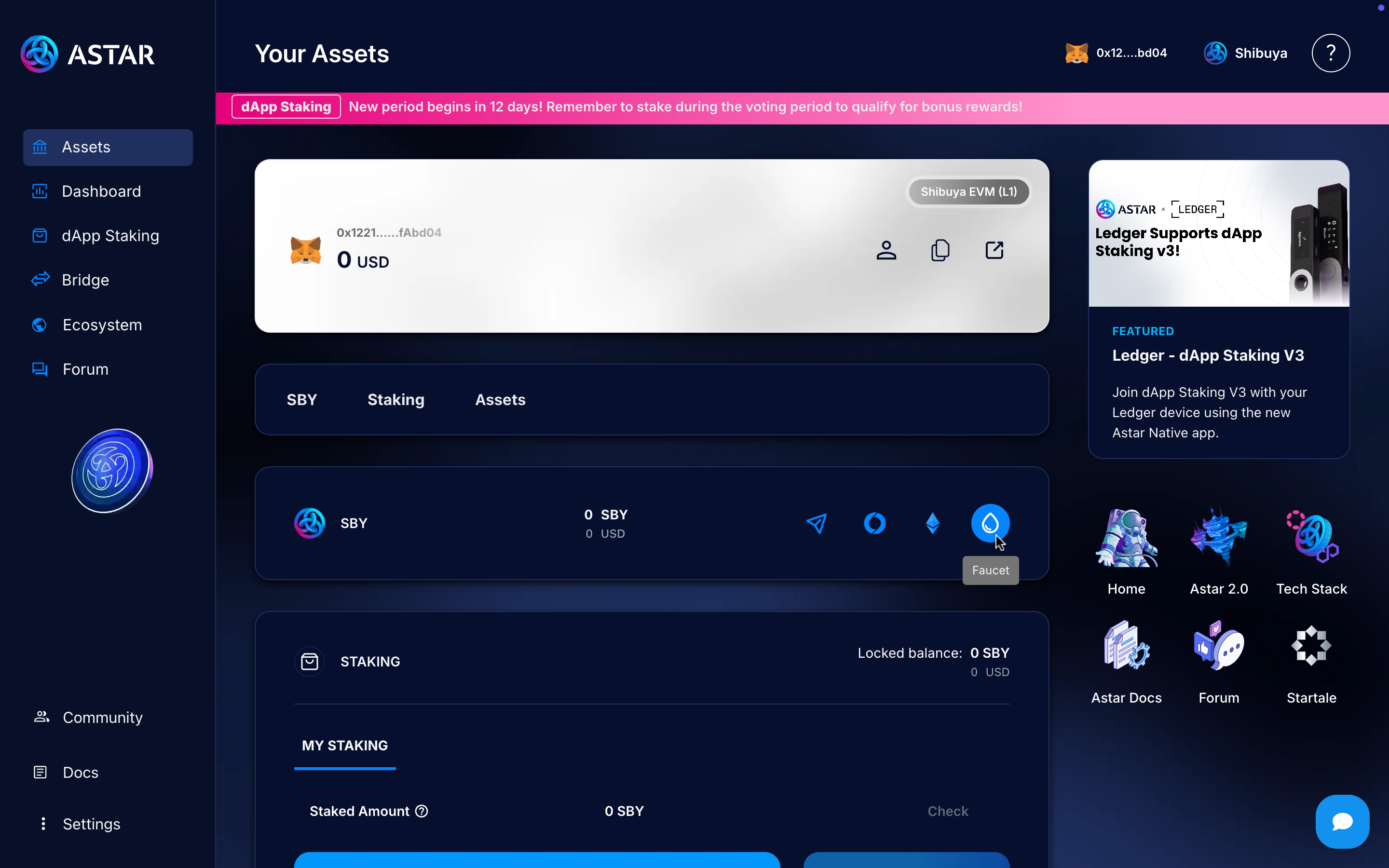 The Astar Portal also serves as the main faucet for the entire Astar Network ecosystem and its networks (Testnet → Shibuya, Canary Network → Shiden). Through it, you can obtain test tokens for the Shibuya network, or a small amount on Shiden and Astar Network to cover the gas fees for your first transactions. This ensures that your initial funds never get stuck due to a lack of ASTR for gas.