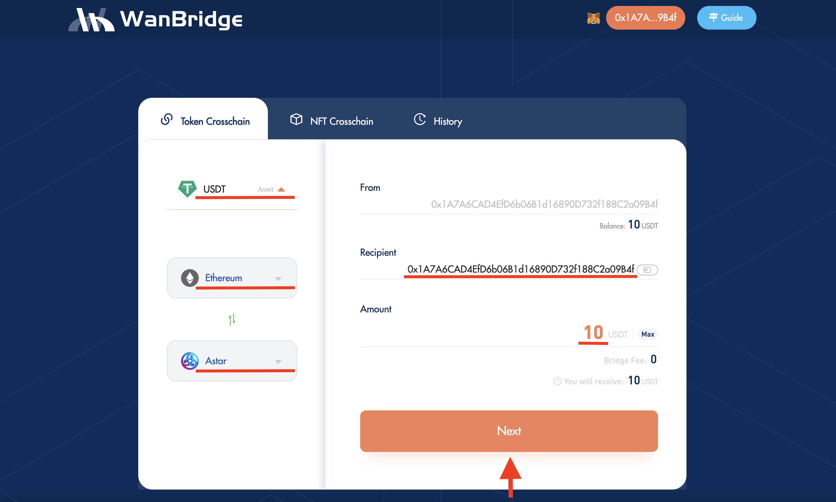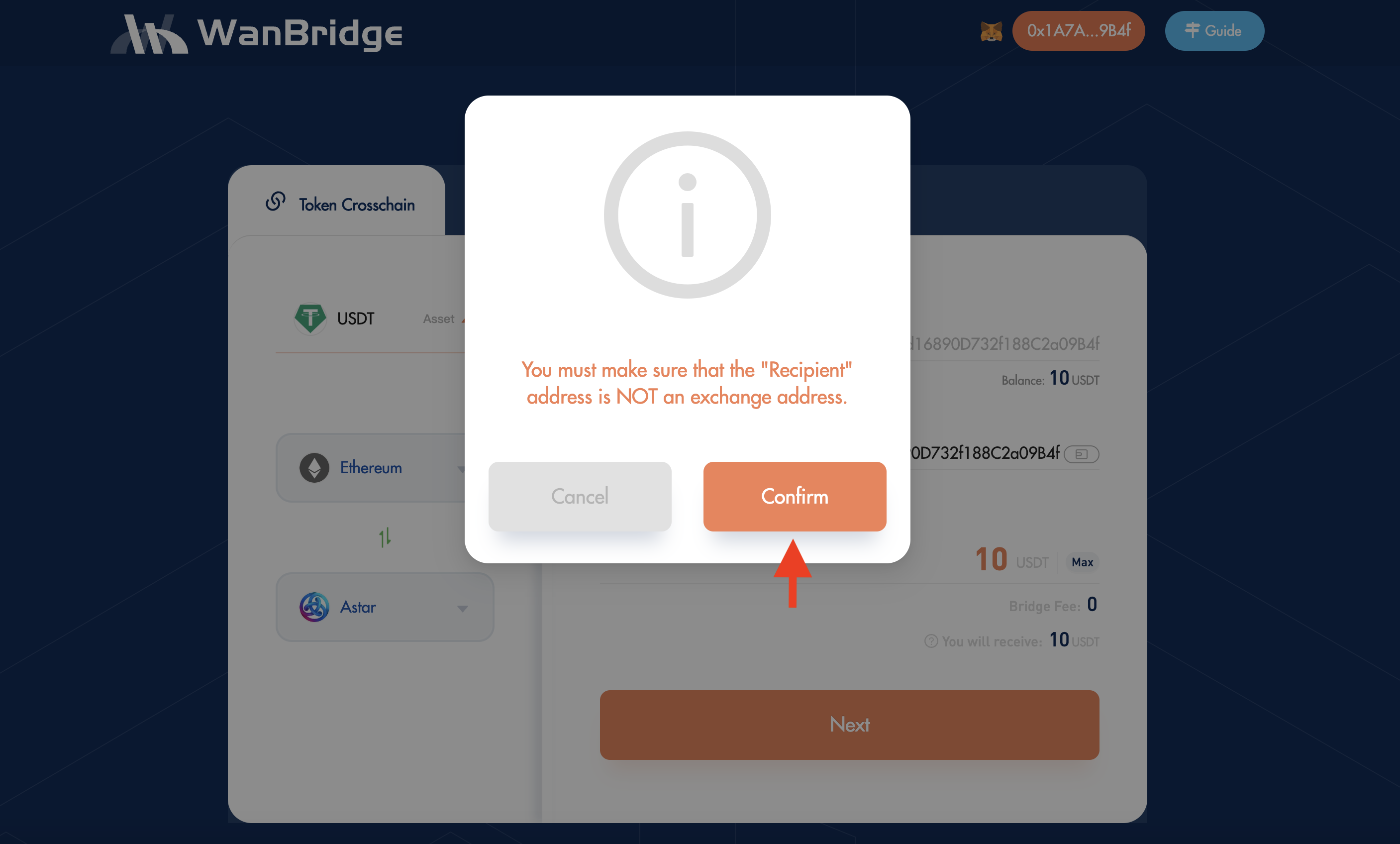 Visit the Wanchain Bridge web portal. Initiate a cross-chain transaction to move your $USDT from Ethereum to Astar.