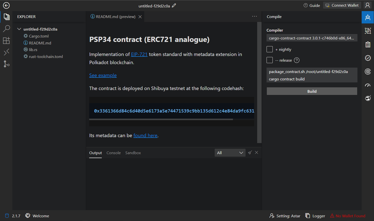 Astar WASM IDE offers developers a variety of basic or complex templates, such as Flipper, PSP22, PSP34, Magink-dApp, and more. Click to access a template.