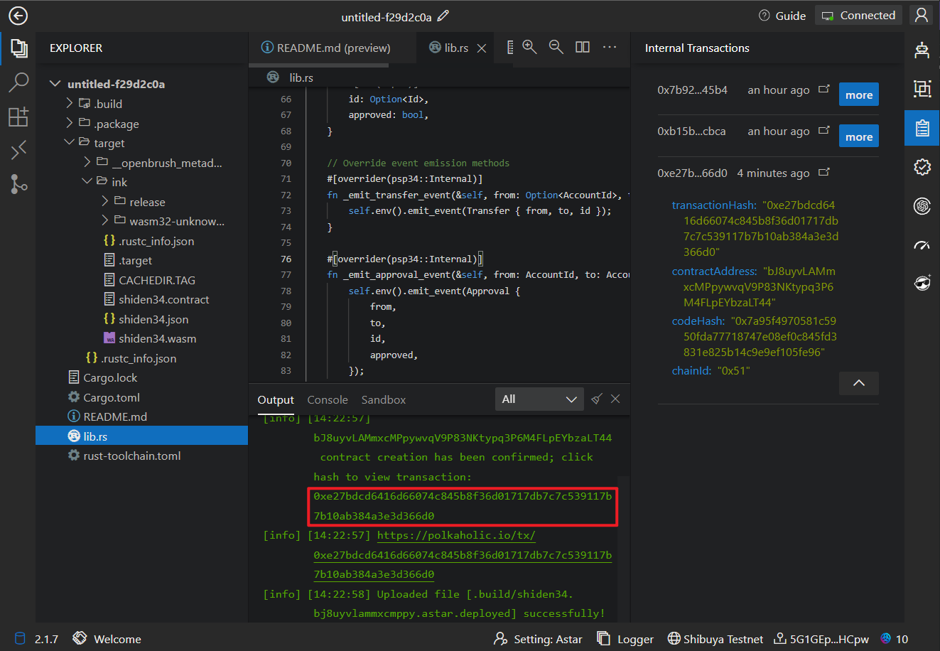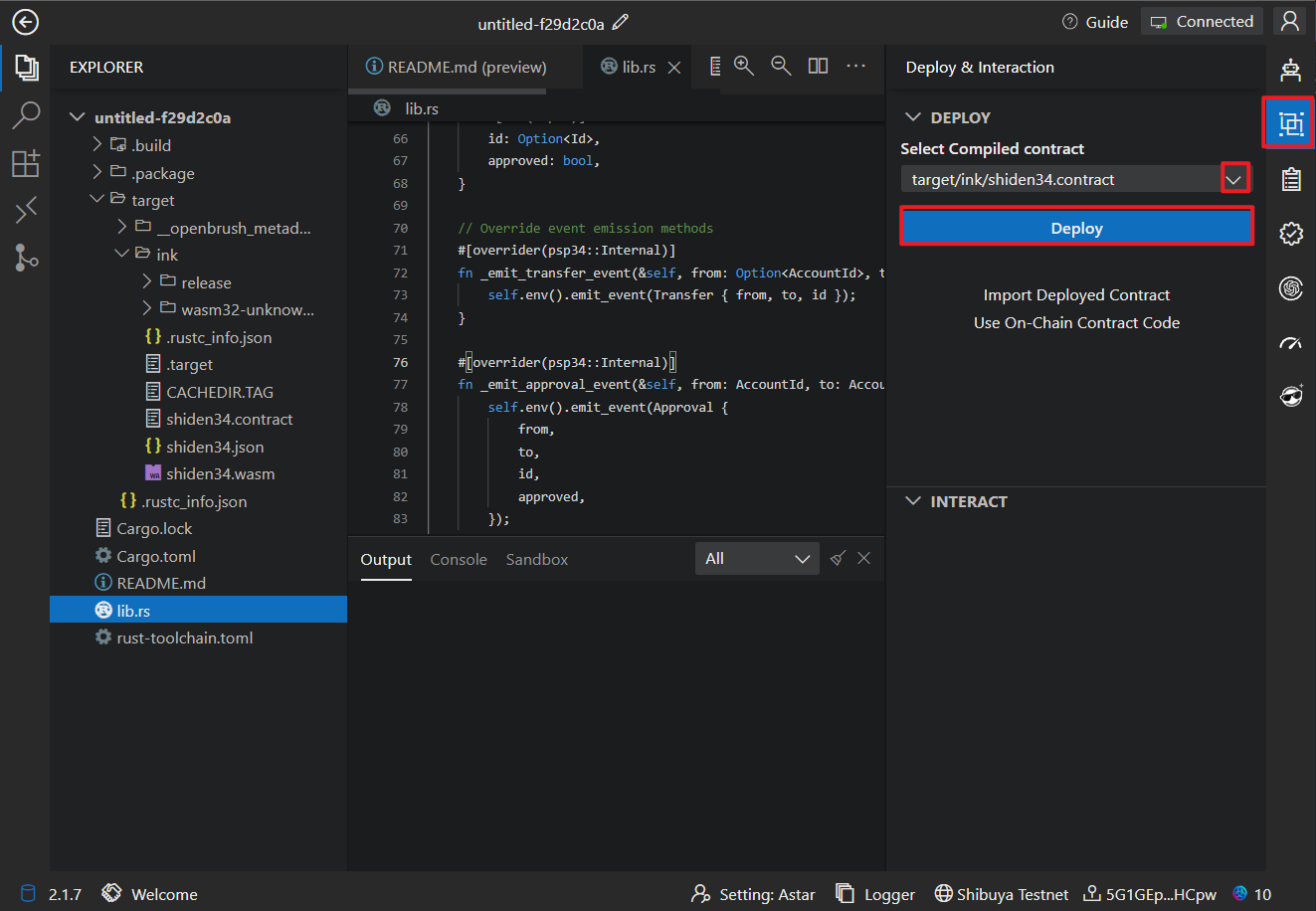 After a successful compilation, the left-hand Explorer panel will display the "target/ink" folder, and within that folder, you will find the "***.contract" file (used for deploying the contract).