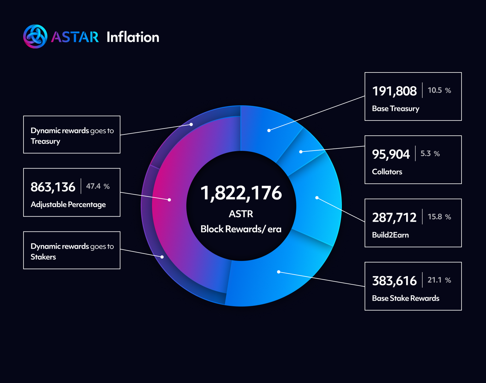 For each block produced, Astar issues a fixed number of tokens. Initially, these numbers were chosen to generate approximately 10% inflation, based on the initial supply.