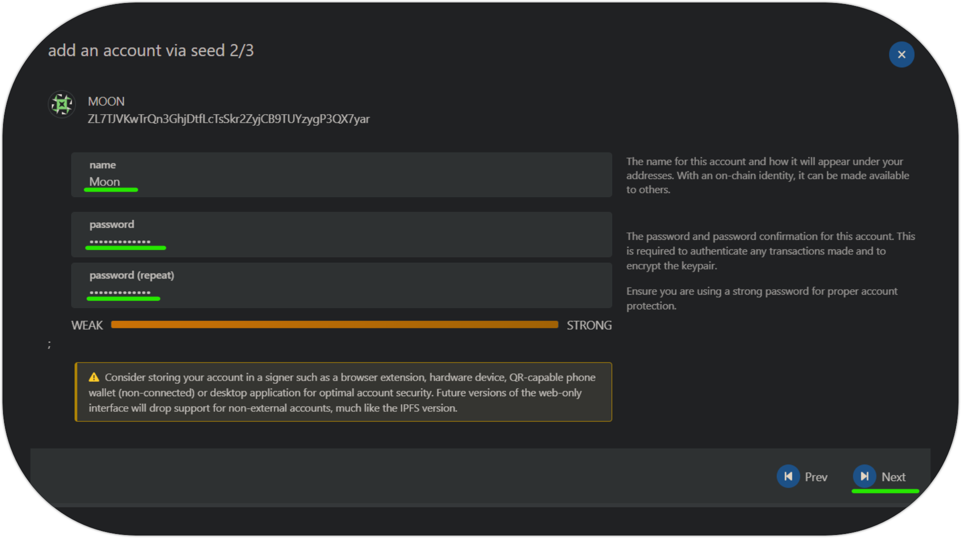 ; - The wallet is now restored on the Polkadot{.js} extension;