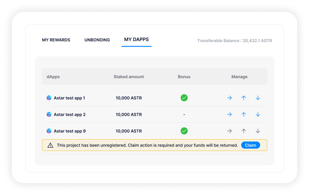You can manage your rewards from the dApp Staking page and collect them by clicking the Claim Button and signing the transaction.