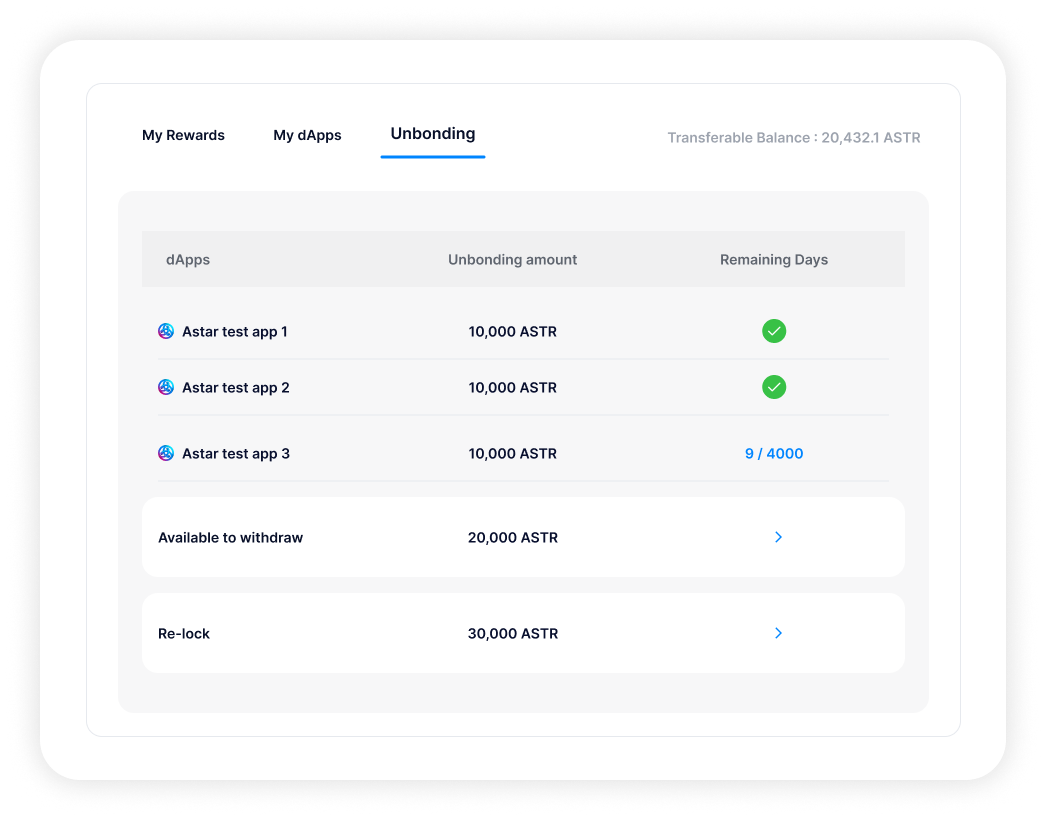 ; - Re-lock: Lock your tokens again to use them in dApp Staking;